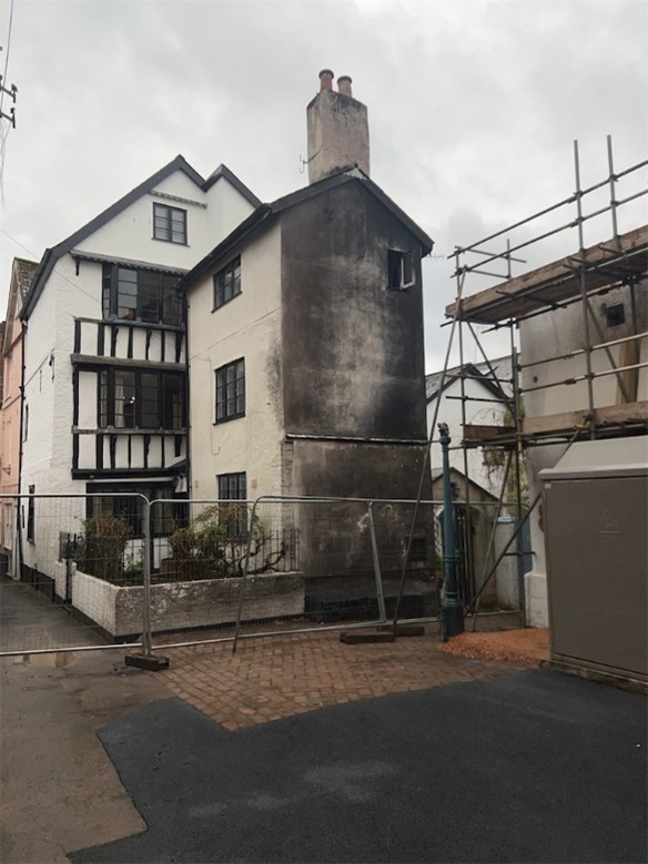 Following a neighbouring fire, a pre-1960s residential property suffered severe soot contamination across its heavily textured exterior render.